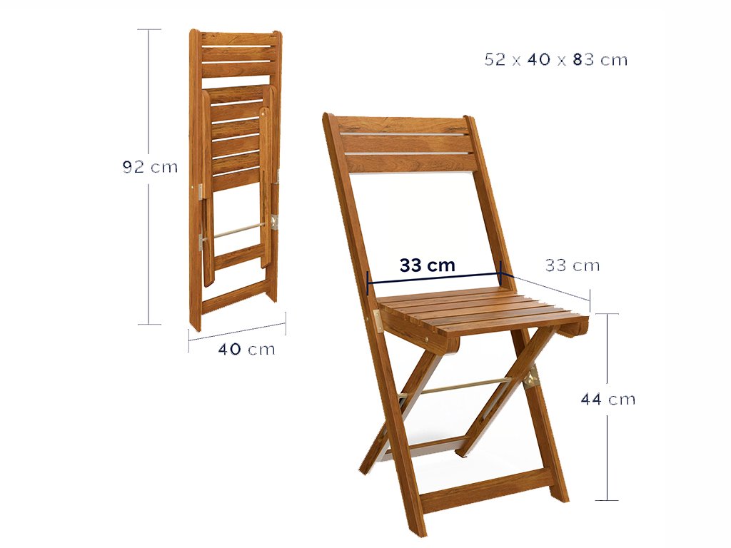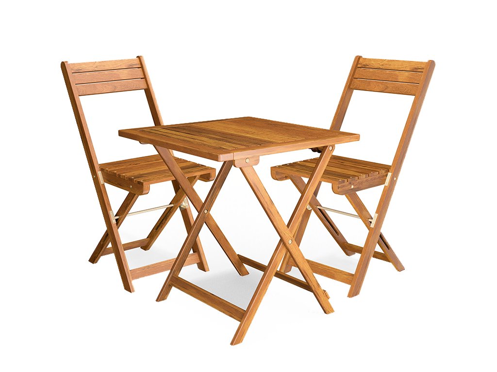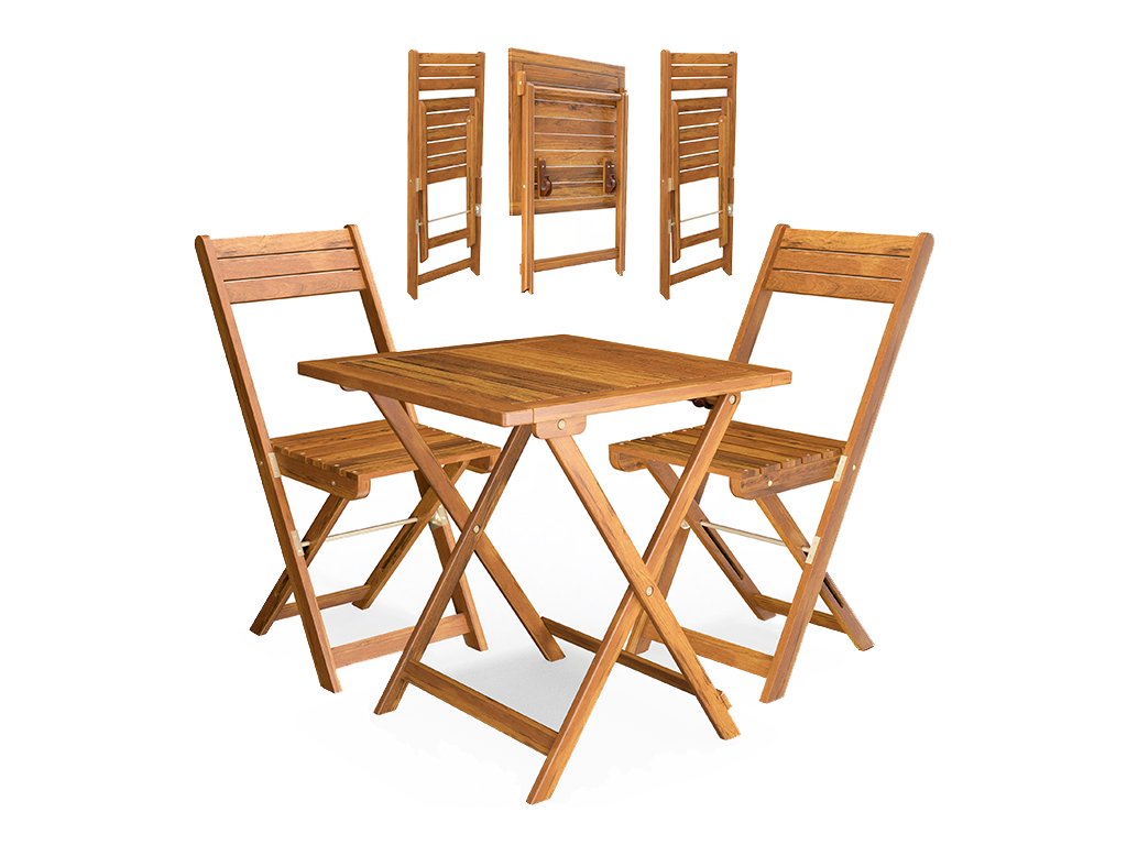 Praktični balkonski set sastoji se od jednog stola i dvije stolice te je izrađen od visokokvalitetnog masivnog bagremovog drva. Cijeli set je sklopiv, pa se lako pohranjuje i štedi prostor. Prostrana ploča stola idealna je za doručak, kavu ili druženje s prijateljima na balkonu, terasi ili u vrtu.