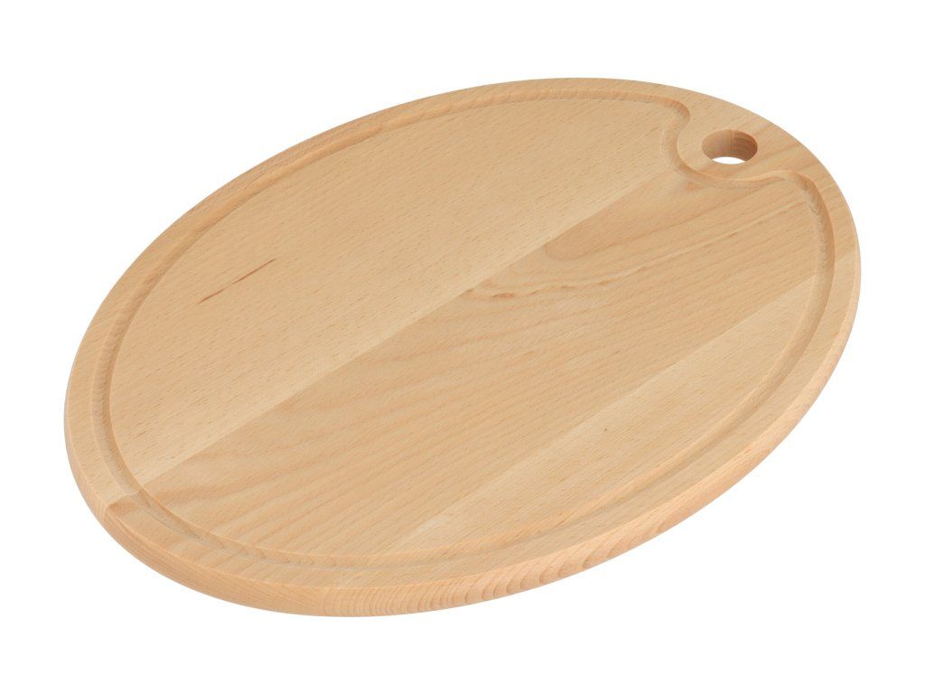 Ovalna daska za rezanje od bukovog drveta sa praktičnom rupom za vješanje. Odvodni kanal je također praktičan, što je korisno za rezanje mesa i voća sa sokom.