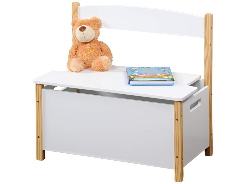 Drvena dječja klupa dizajnirana je tako da spriječi nenamjerno priklještenje dječjih prstiju. Djeca tako mogu sama čistiti igračke i po potrebi ih iznajmljivati.