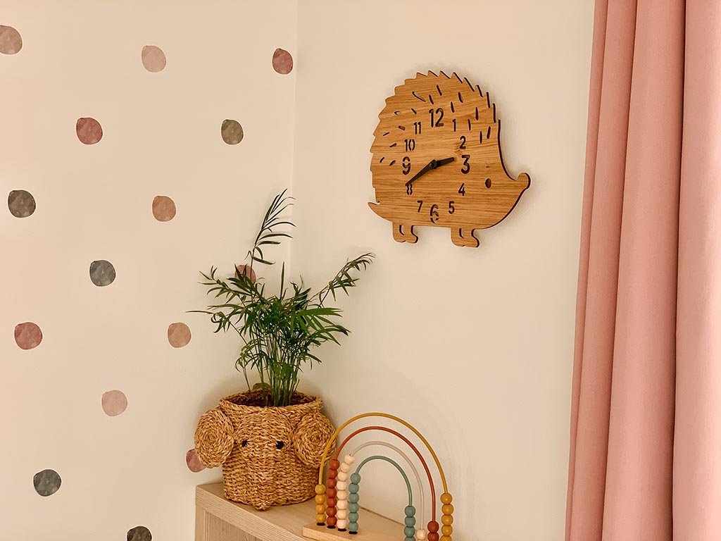 Zahvaljujući minimalističkom dizajnu, dječji zidni sat idealan je dodatak dječjoj sobi. Brojevi na brojčaniku su izravno urezani u drvo. Kvalitetni njemački mehanizam UTS Quartz je tih i besprijekorno radi, kazaljke su crne boje.