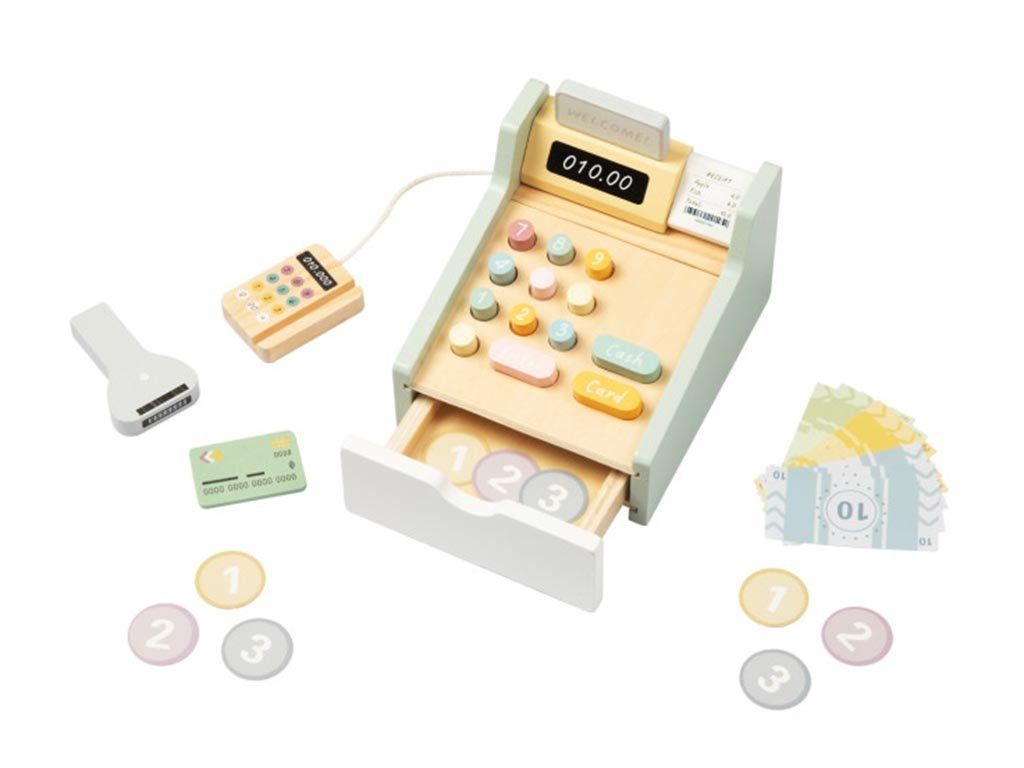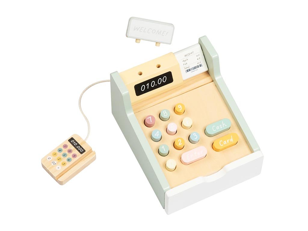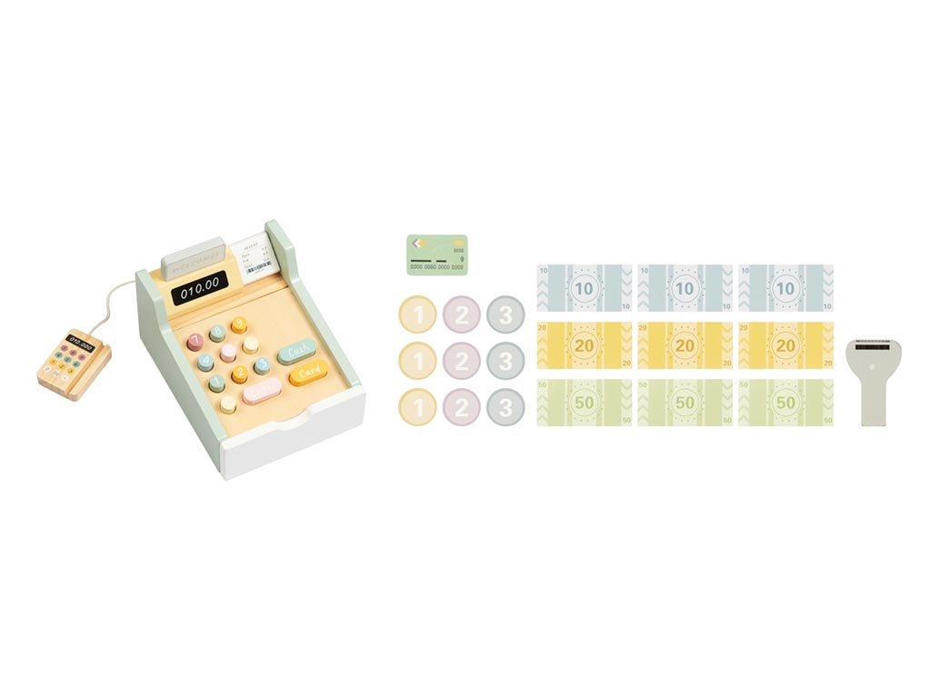 Blagajna ima realistične drvene kovanice i novčanice, gumbe i praktičnu ladicu za novac koja se otvara i zatvara. To omogućuje djeci da se s prijateljima ili obitelji odglume prodavača, kupaca, pa čak i cijelu poslovnu scenu. Igra potiče maštu, kreativnost i društvenu interakciju.