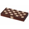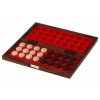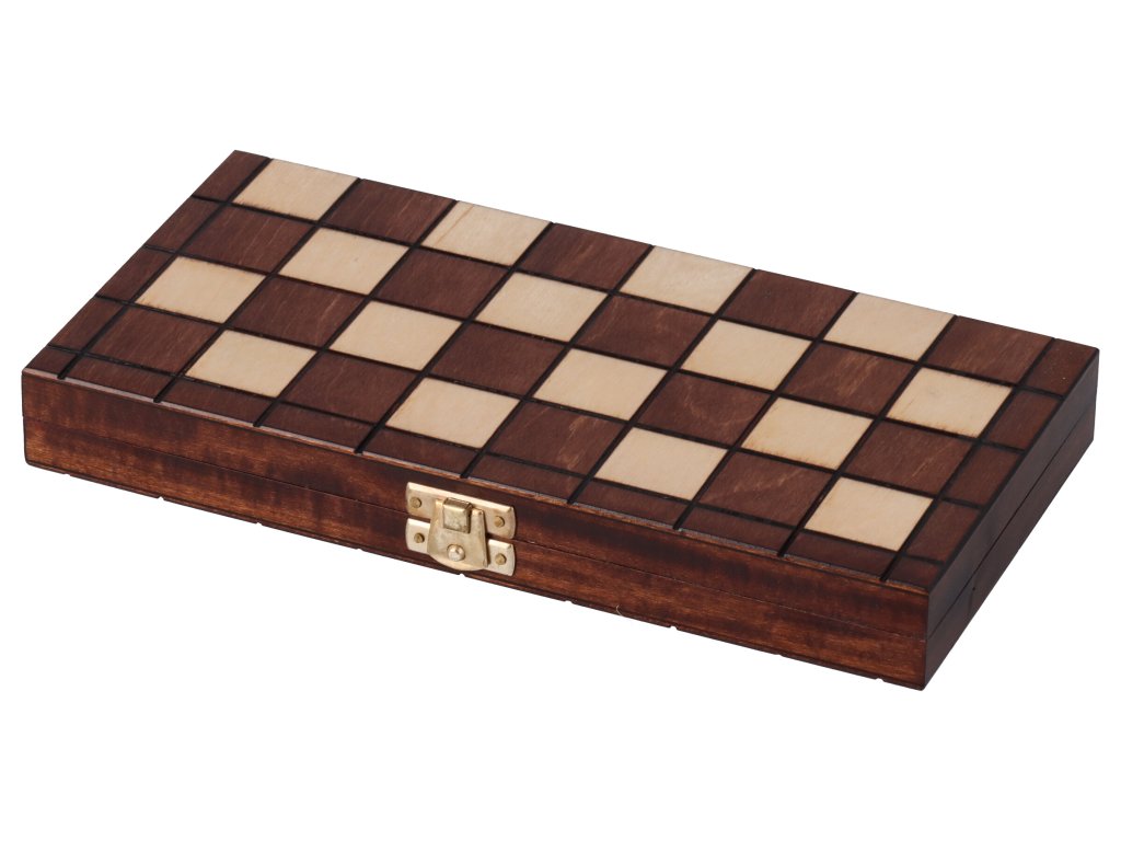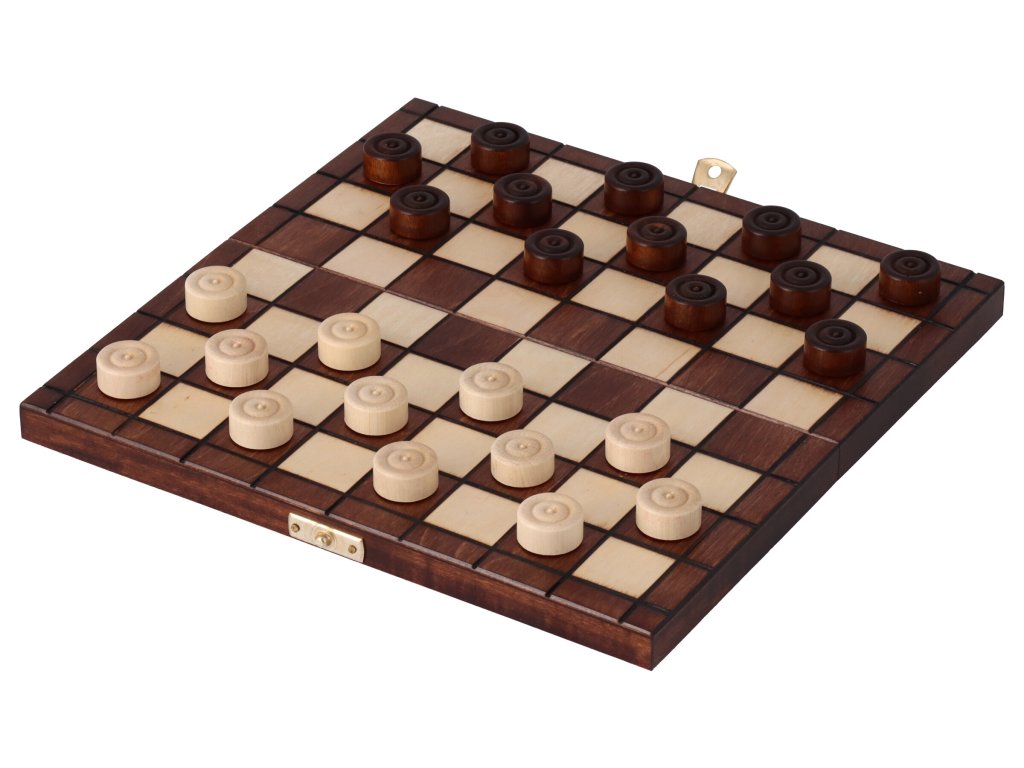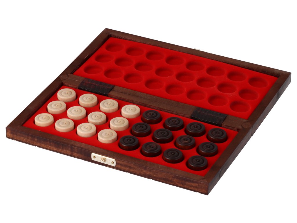 Detaljne drvene dame s igraćom površinom od 25 x 25 x 2 cm. Figure promjera 20 mm spremaju se u precizno pristajajuće podstave.