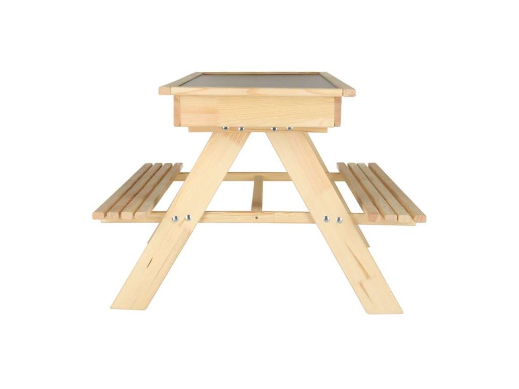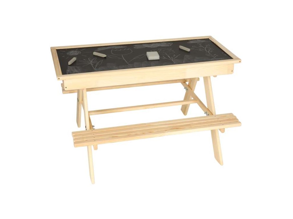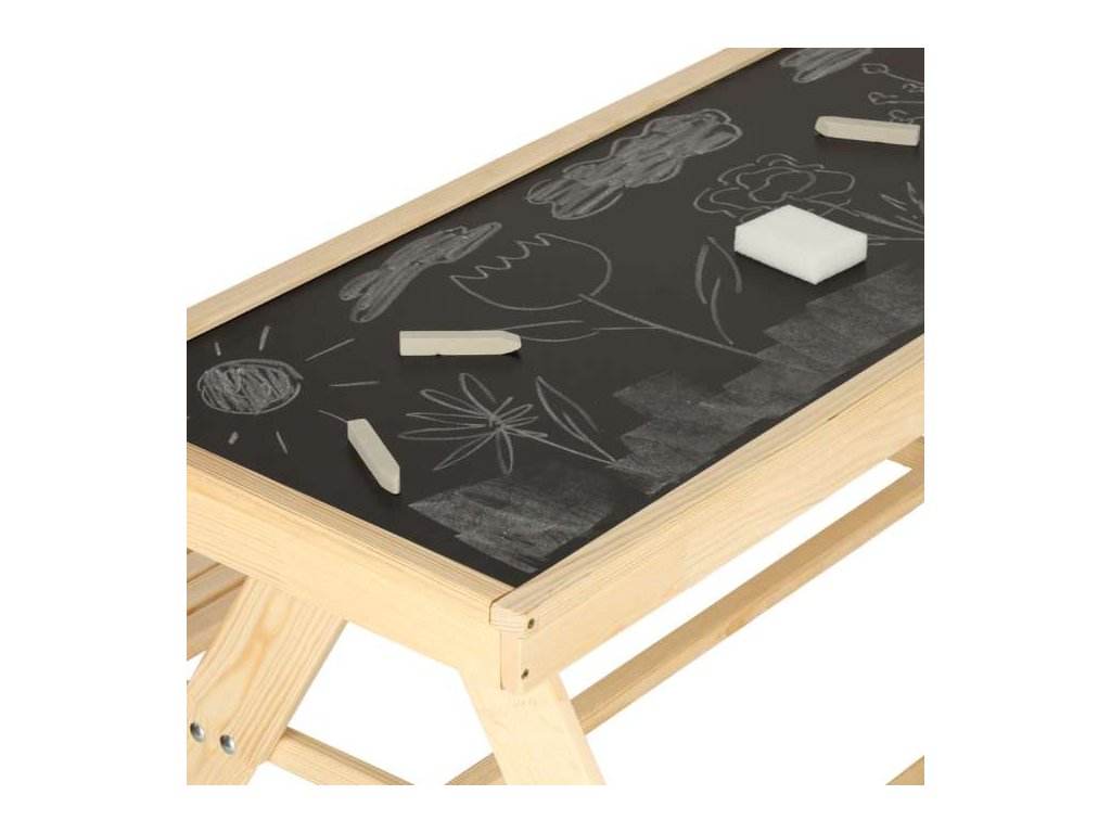 Set sadrži stol i 2 klupe od borovine. Slobodni prostor na stolu služi kao pješčanik, koji pomoću lesonita možete jednostavno pretvoriti u školsku ploču. U paketu su kreda i spužva na ploči.