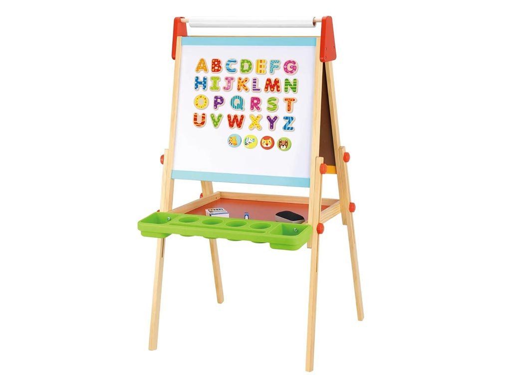 Visokokvalitetna drvena izrada s glatkim rubovima i sigurnim bojama osigurava dug vijek trajanja i sigurnu upotrebu. Drvena dvostrana ploča odličan je izbor za djecu koja vole stvarati, crtati i otkrivati nove stvari.