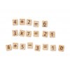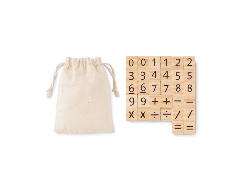 Skup sadrži po dva broja od 0 do 9 i matematičke simbole + - × ÷ = /. Kocke dimenzija 1,8 x 2 x 0,5 cm izrađene su od najkvalitetnijeg bukovog drveta i pohranjene su u pamučnu vrećicu.