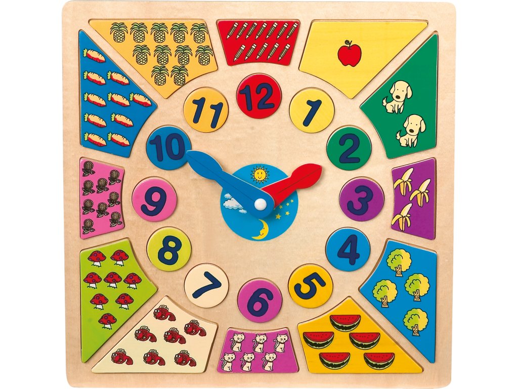 Drveni umetak pomoći će djeci u razvoju fine motorike, učenju osnovnih brojeva i prepoznavanju vremena. Šareni dizajn s motivima životinja i povrća očarava djecu.