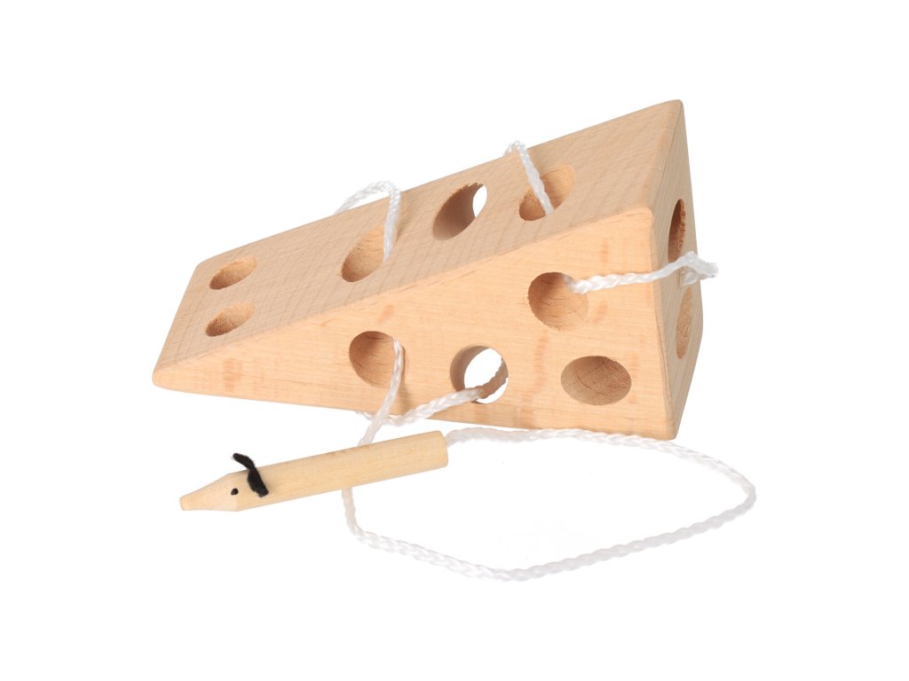 Originalna drvena mašina za uvlačenje konca u obliku sira sa malim mišem koji se provlači kroz rupice. Igračka će zabaviti djecu i ujedno pomoći u vježbanju fine motorike.