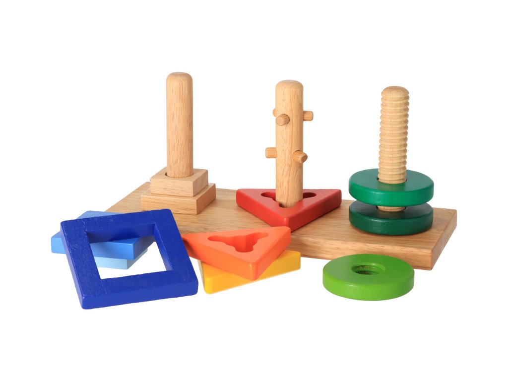 U setu se nalazi daska s tri kolca na koju je potrebno postaviti pravilan oblik i okretanjem ga pomicati po kolicu.