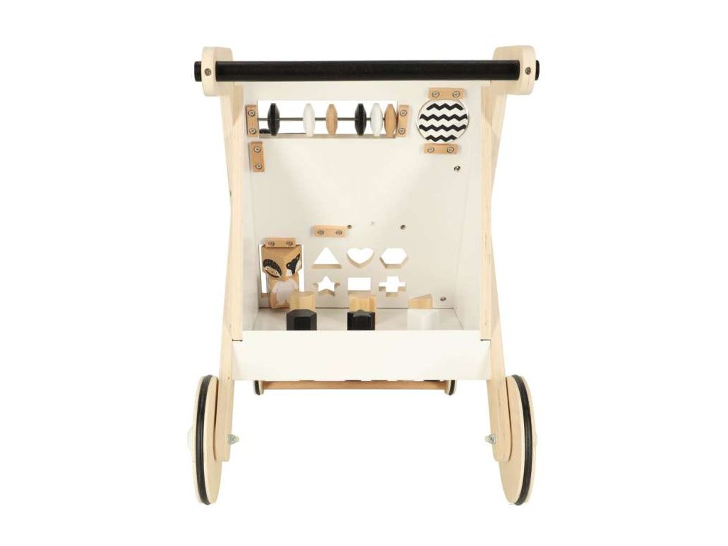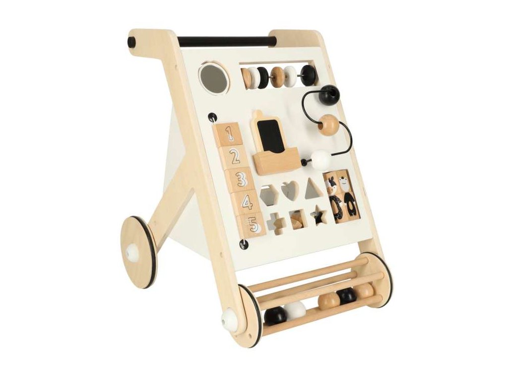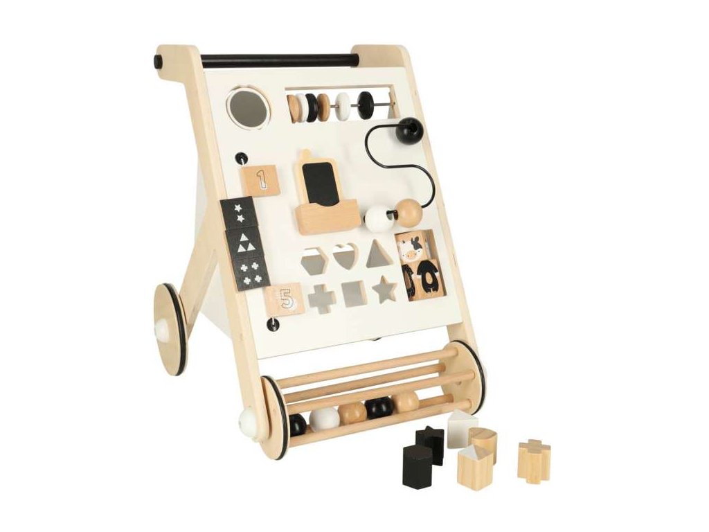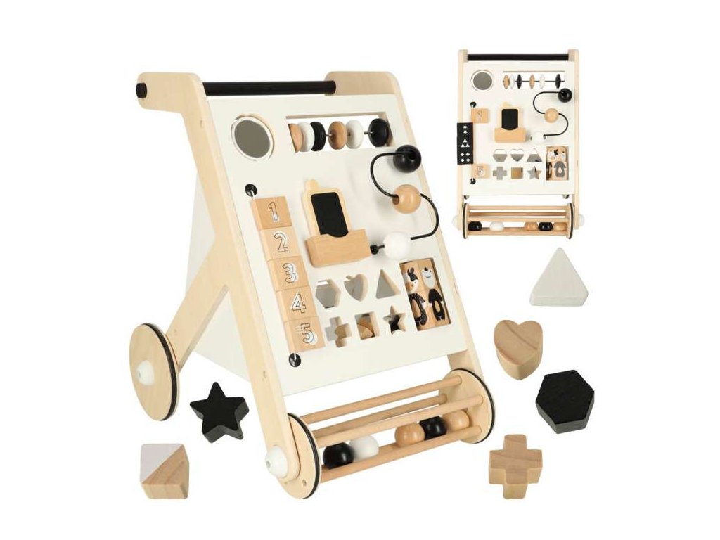 Drvena hodalica ima ugrađene edukativne igračke koje će zabaviti vaše dijete čak i ako mu se ne da praviti izazovnije korake! Pomicanje klikera, preslagivanje pločica s brojevima ili razvrstavanje kockica jednostavne su igre koje donose mnogo prednosti! Omogućit će poticanje djetetovih manuelnih sposobnosti, posebice fine motorike kada je u pitanju rad prstiju i ruku.