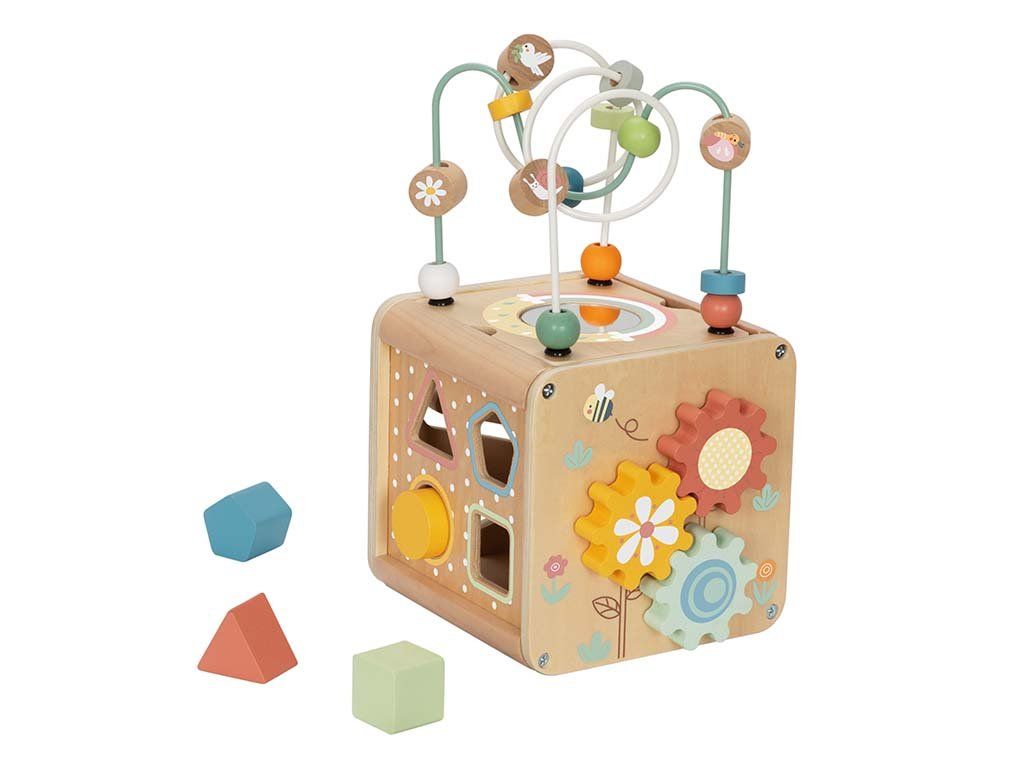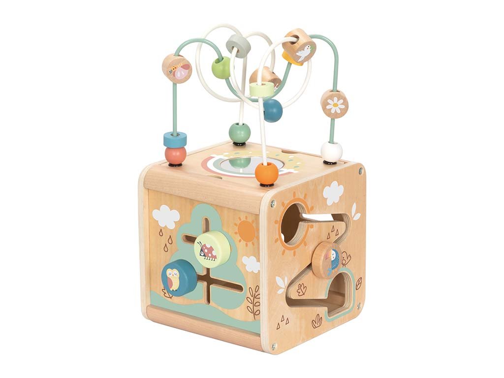 Kocka je izrađena od visokokvalitetnog drva i ukrašena suptilnim motivima prirode koji imaju smirujući i razigran osjećaj. Zahvaljujući raznolikosti aktivnosti, djeca uče prepoznavati oblike, boje i poboljšavaju koordinaciju ruku i očiju tijekom igre.