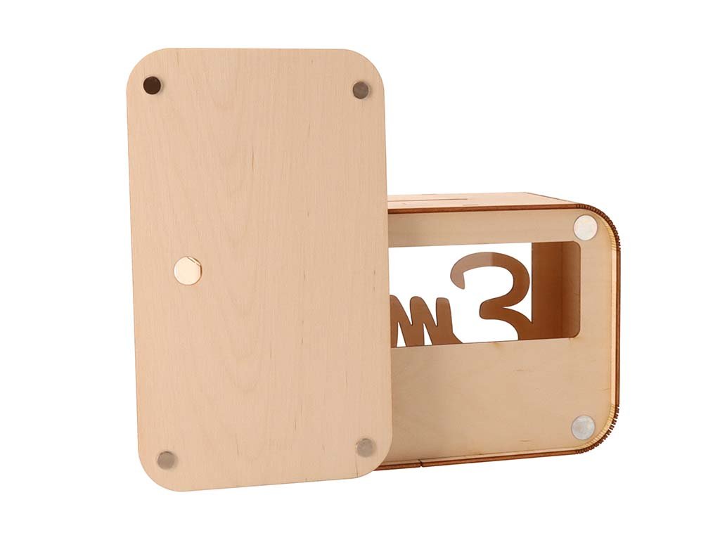 Kasa je izrađena od prirodne šperploče breze. Prednja strana kase upotpunjena je prozirnim pleksiglasom.
