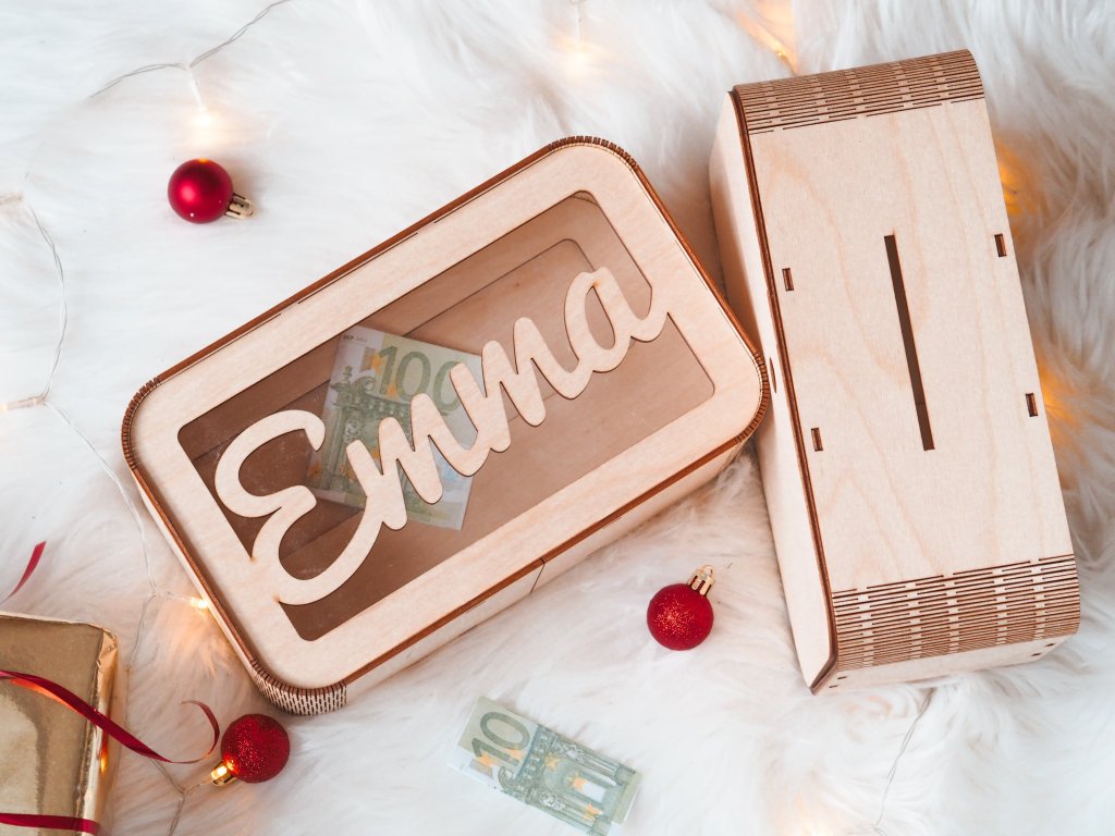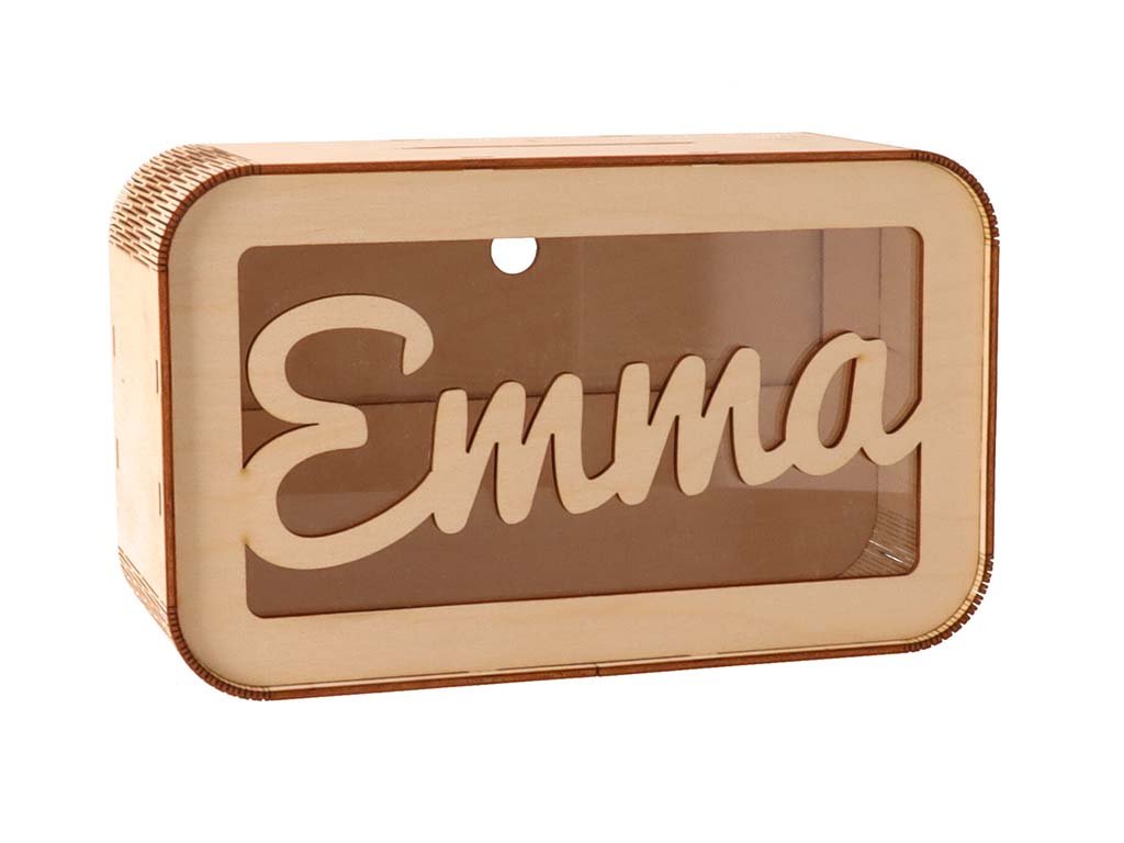 Drvena kasica prasica s imenom idealna je za sve koji žele štedjeti za svoje snove. Ova personalizirana kutija s blagom odlična je i za sve vrste proslava, vjenčanja i proslava djeteta. Blagajnu stavite na stol i gosti će joj moći priložiti bilo koji iznos.