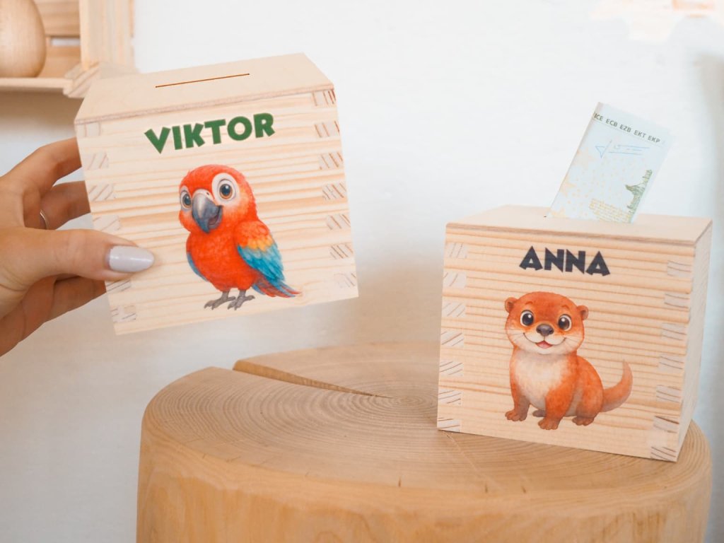 Drvena kasica za djecu s imenom je odličan poklon za rođendan i Božić. Također može biti korisna kada planirate davati djetetu redovito džeparac. Dajte mu njegov prvi novac na originalan način u personaliziranoj kasici.