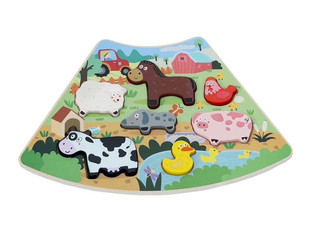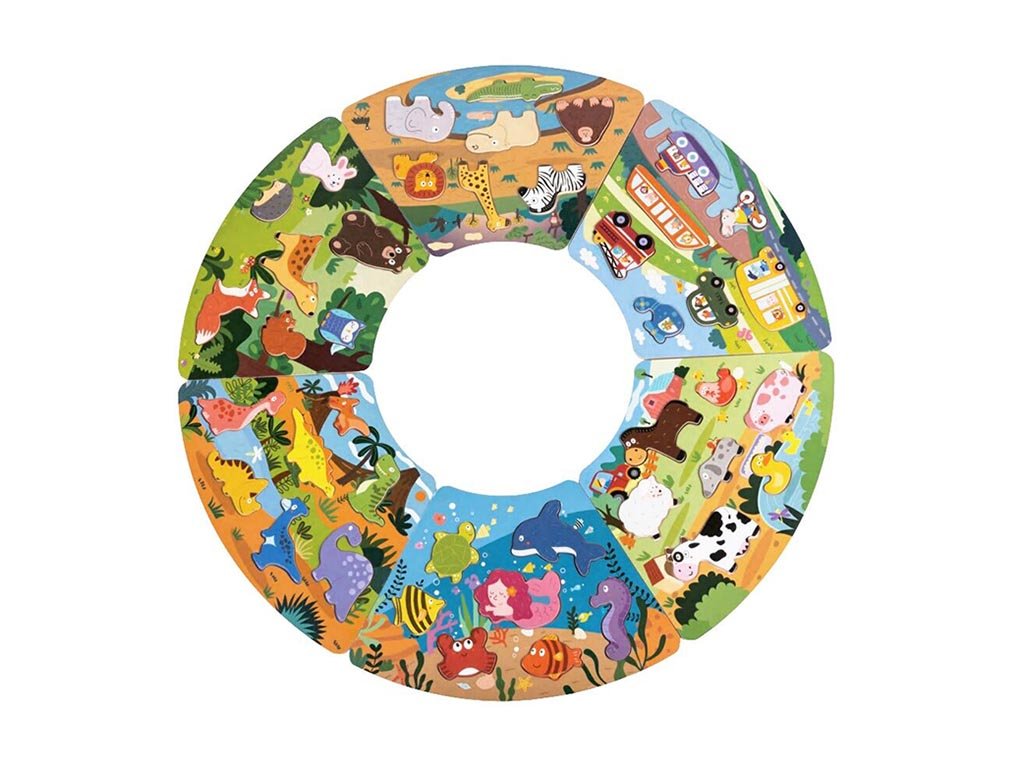 Ova šarena slagalica razvija logičko razmišljanje i motoričke sposobnosti na razigran način. Set od šest spojivih dijelova zajedno stvara krug pun šarenih i raznolikih scena.