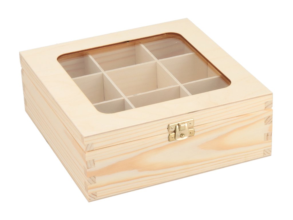Prekrasna drvena kutija sa sigurnim zatvaranjem u koju možete pohraniti sve svoje omiljene čajeve. U ovom obliku ih također možete vrlo elegantno i stilski ponuditi svojim posjetiteljima. Unutrašnjost je podijeljena na 9 odjeljaka koji odvajaju različite vrste čaja. Zahvaljujući prozirnom staklenom poklopcu uvijek ćete imati pregled nad sadržajem.