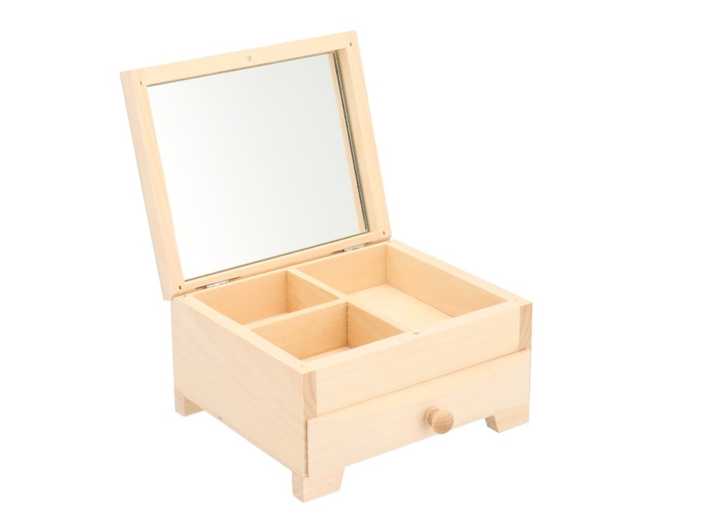 U kutiji za nakit, nakon otvaranja poklopca, pronaći ćete praktično ogledalo i 3 pretinca. Jedan veći i dva manja. Osim toga, ima i ladicu na izvlačenje u koju možete pohraniti druge male dragocjenosti.