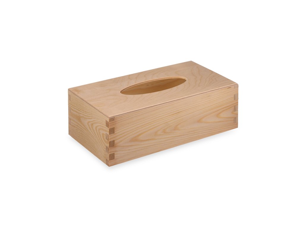 Kutija za maramice izrađena je od borovine, a gornji i donji dio od šperploče. Dno se uvlači.