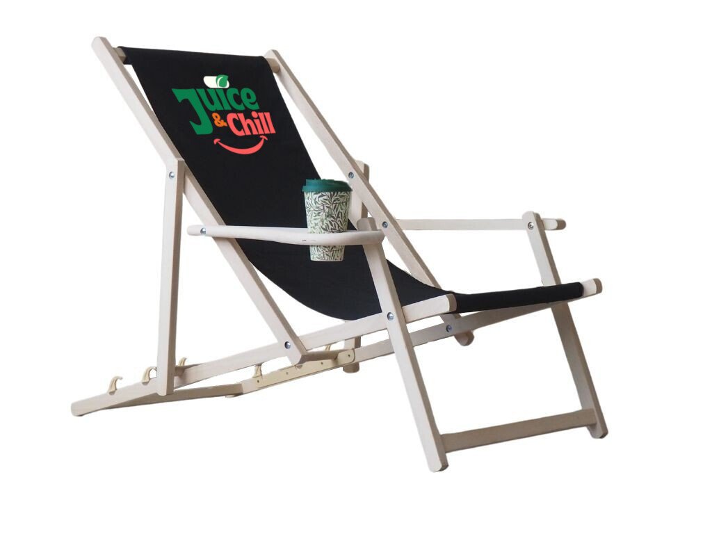 Na drvenoj ležaljci cijenit ćete stabilnu strukturu od bukve i čvrstu tkaninu, zahvaljujući kojoj se sklopiva ležaljka može pohvaliti visokom nosivošću. Crna verzija ima moderan zaokret i pristaje i unutra i vani. Nasloni za ruke i držač za piće osiguravaju udobno sjedenje. Nudimo tisak u boji već od 10 komada po super cijeni!