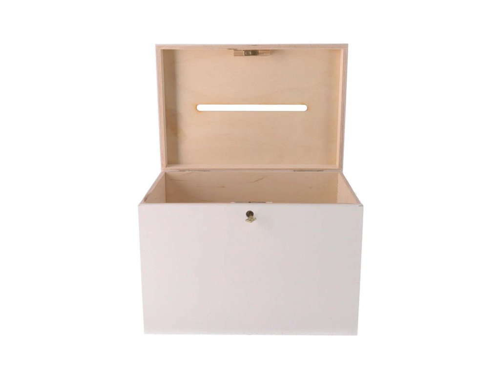 Drvena kutija za vjenčane kuverte danas je nezaobilazan dio svakog vjenčanog ureda, ali i drugih proslava. Najčešći pokloni za mladence su kuverte s novcem, kartice ili srećke. Drvena škrinja bit će odlično organizacijsko rješenje da ih skupite na jednom mjestu i osigurate da se nitko od njih ne izgubi. Također je opremljen ključem i može se sigurno zaključati.