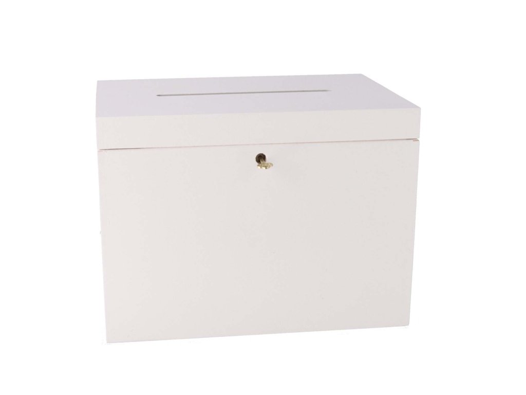 Bijela drvena škrinja za vjenčane čestitke ili kuverte s novcem gotovo je neophodna na svakom vjenčanju, ali i na obiteljskim proslavama. Zahvaljujući izrezu na vrhu, omotnica udobno upada.
