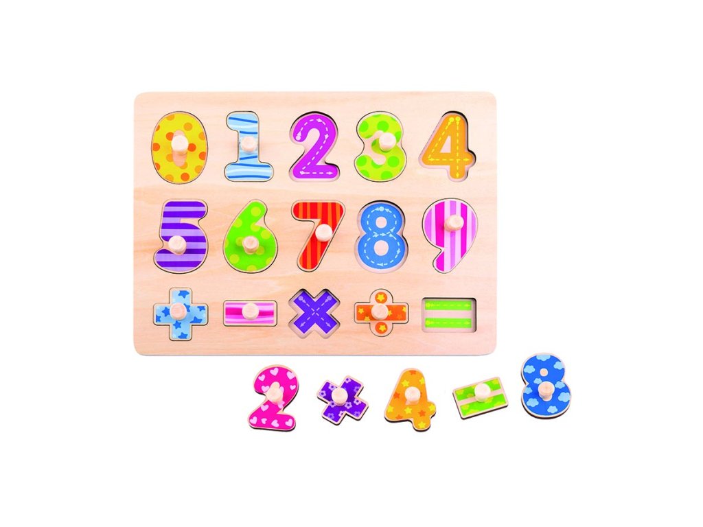 Šarene drvene slagalice s brojevima upoznaju djecu s jednostavnim matematičkim primjerima na zabavan način. Dijelovi imaju male drvene ručke za lakše hvatanje.