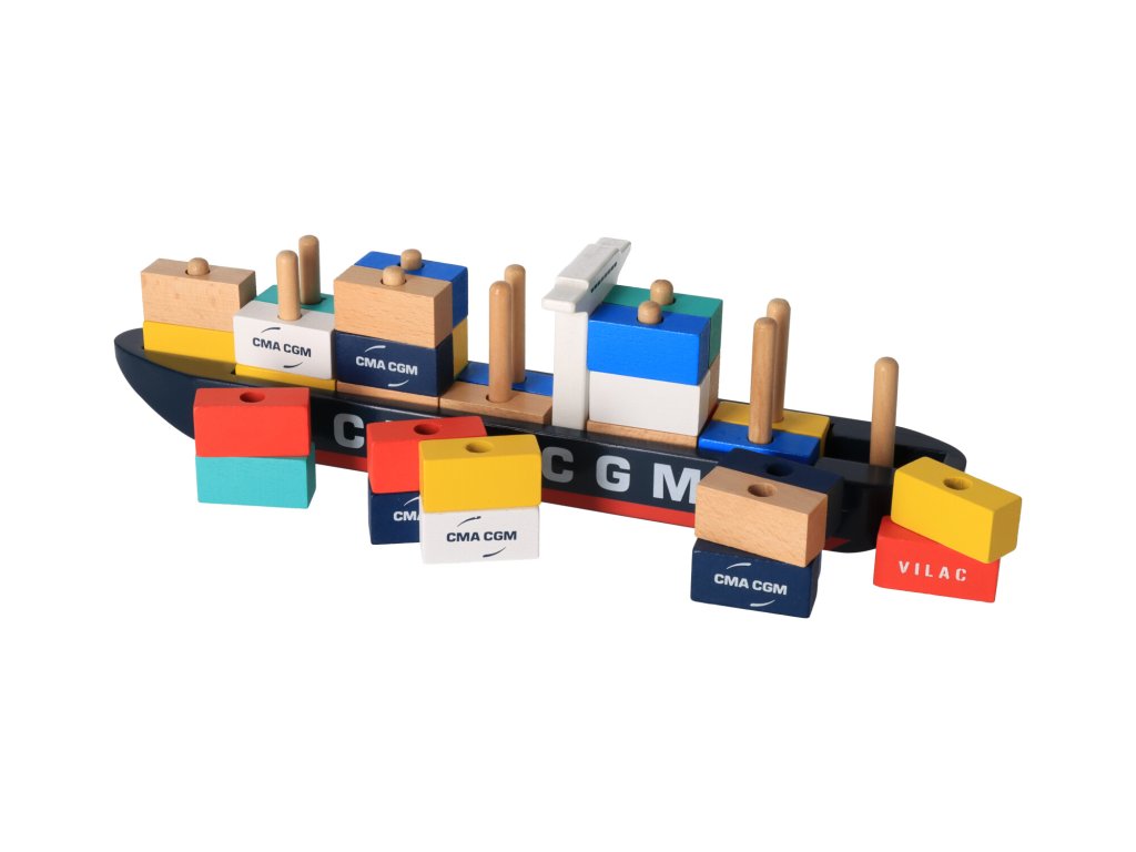 Sve drveni kontejnerski brod. Nakrcati brod kontejnerima i pripremiti ga za isplovljavanje. Igračka je odlična i kao ukras. S ovom igračkom možete jednostavno zabaviti svoju djecu i doživjeti trenutak dugo očekivanog odmora.