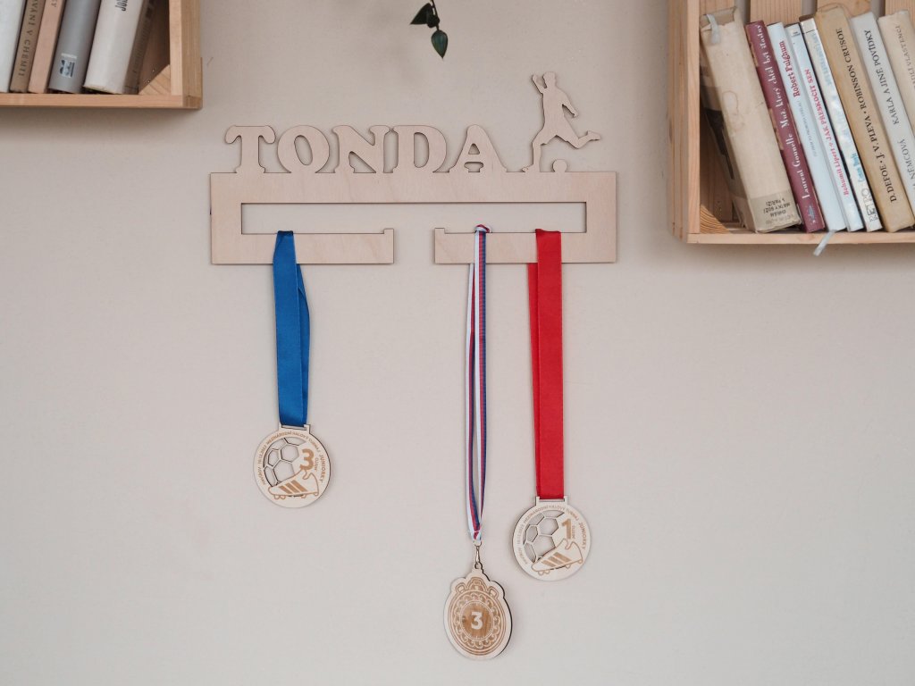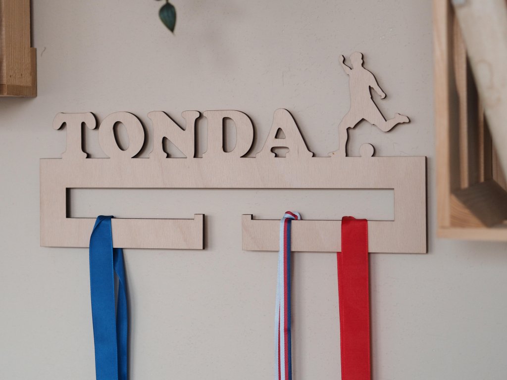 Vješalica za medalje s imenom i sportom omogućuje vam da prikažete postignuća i istovremeno sačuvate radost pobjede. Drvena vješalica također je originalan poklon koji će razveseliti male i velike sportaše.