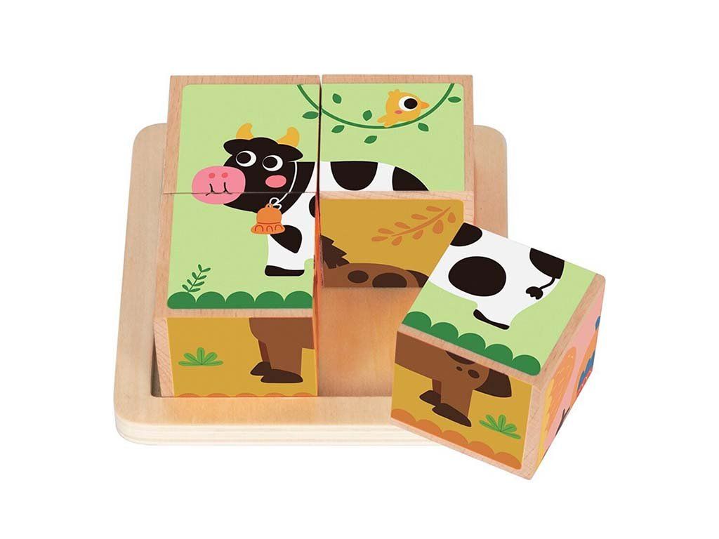 Četiri drvene kocke stvaraju šest različitih slika životinja. Vesele, šarene ilustracije domaćih životinja svidjet će se djeci, a kocke će brzo postati njihova omiljena igračka.