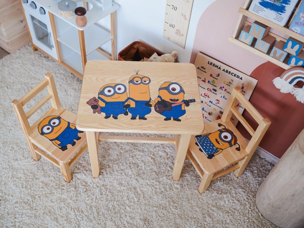 Drvena garnitura od stola i dvije stolice s motivom veselih Mimona uljepšat će dječju sobu i postati najpopularniji komad namještaja.