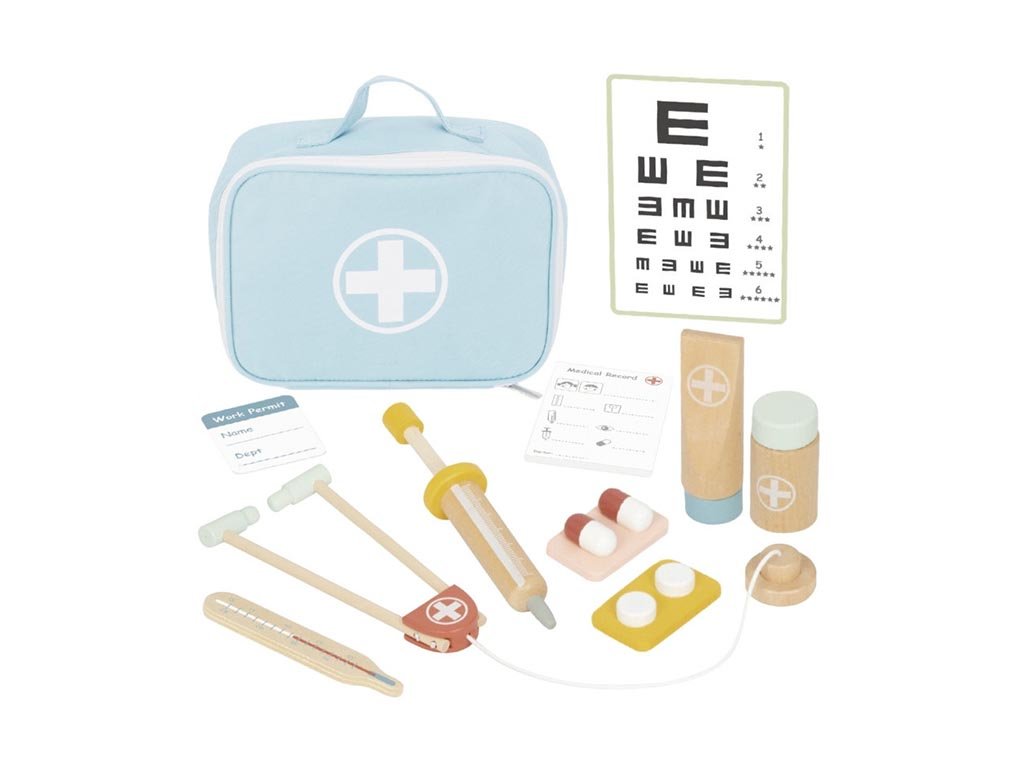 Pretvorite dječju sobu u malu liječničku ordinaciju. Ovaj drveni liječnički set omogućuje djeci da isprobaju ulogu liječnika i brinu se o svojim "pacijentima" - bilo da su to prijatelji, roditelji ili omiljene plišane igračke. Na razigran način otkrivaju svijet medicine i uče osnove zdravstvene skrbi.