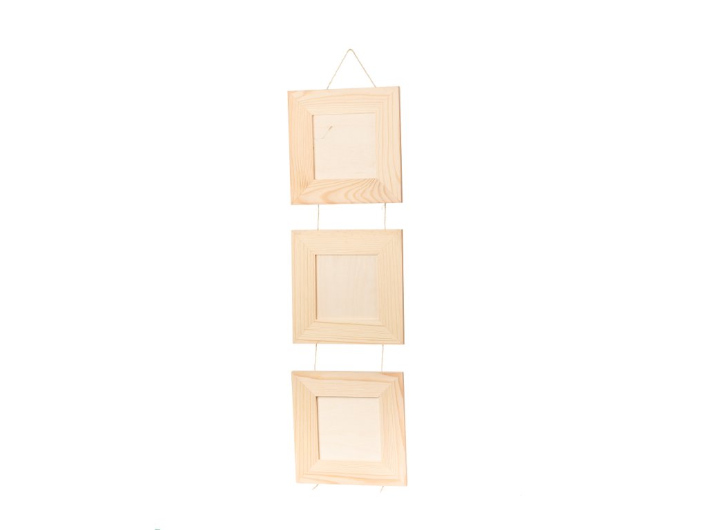 Set od tri drvena okvira za fotografije od borovine na špagi, pogodna za vješanje.
