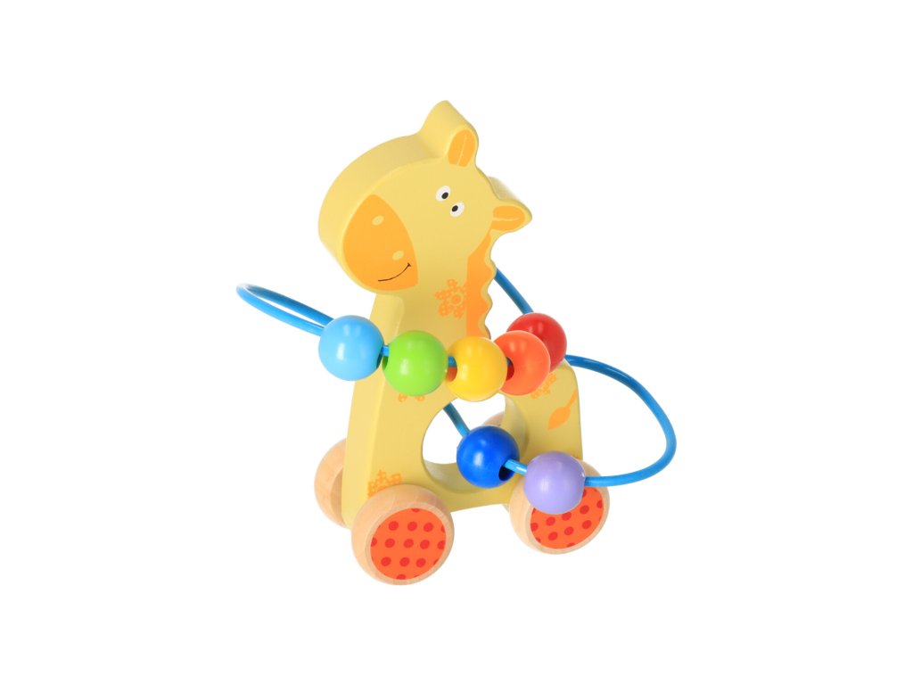 Djeca će se jako zabaviti s ovom oslikanom žirafom od bukve na kotačima. Provlačeći perlice kroz žičani labirint vježbat će i finu motoriku.