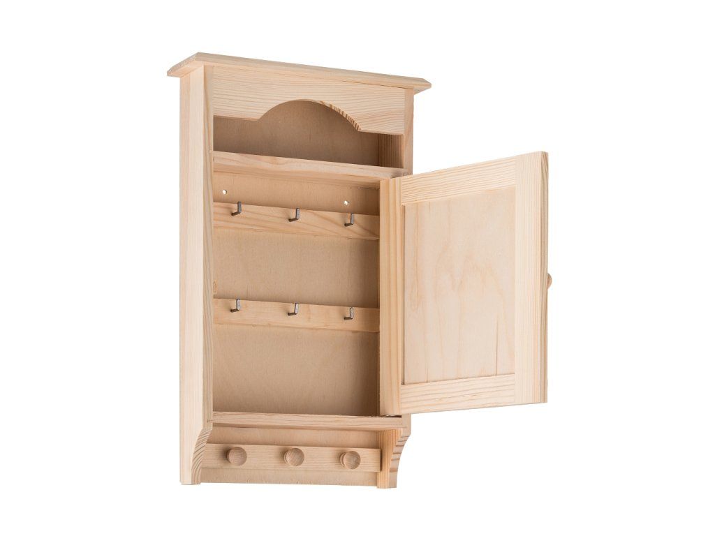 Kutija je izrađena od borovine, a unutra se nalaze metalne kukice za vješanje ključeva. Na dnu ormarića nalaze se drvene pločice koje ćete sigurno cijeniti.