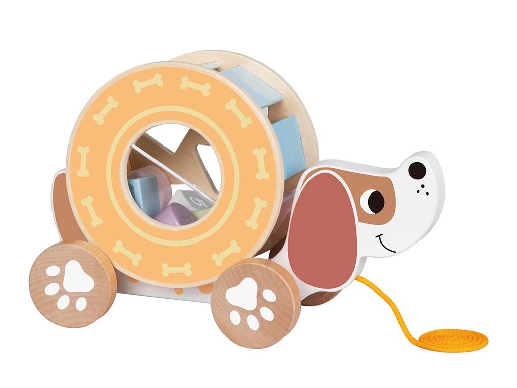 Ovaj slatki drveni pas na konopcu je ujedno i slagalica od blokova. Djeca će se s njim jako zabaviti i istovremeno će na razigran način naučiti prepoznavati oblike i boje.
