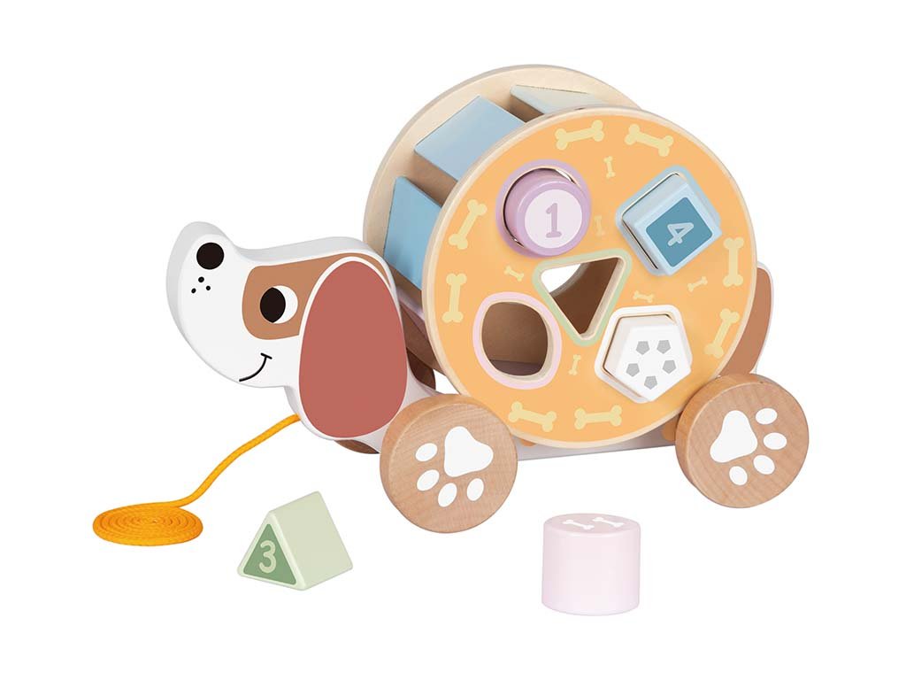 Slatki pas za vučenje bit će odličan prijatelj za prve korake i zabavan pomagač u učenju oblika. Djeca ga mogu voditi za špagu, dok šareno tijelo u obliku bubnja skriva rupe za umetanje kockica. Svaki oblik ima svoje mjesto, pa djeca treniraju finu motoriku, logičko razmišljanje i prepoznavanje brojeva i boja. Pas spaja radost kretanja s kognitivnom igrom, pa će biti popularna igračka kod kuće i u pokretu.
