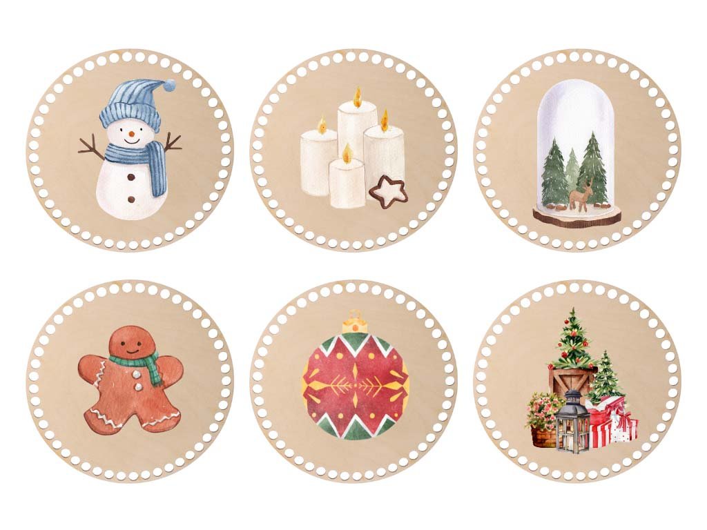 Kolekcija od 6 okruglih izrezaka od brezove šperploče s božićnim motivom prikladna je za izradu elegantnih podmetača i košara koje će uljepšati vaš interijer.