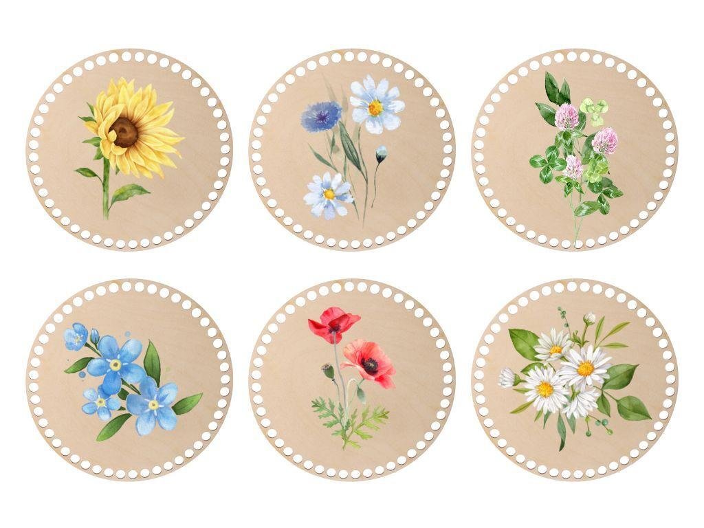Okrugla drvena podloga sa šarenim motivom pogodna je za izradu elegantnih podmetača, kukičanih košara i organizatora. Nudimo razne vrste, a kod nas možete kupiti i prikladne pređe.