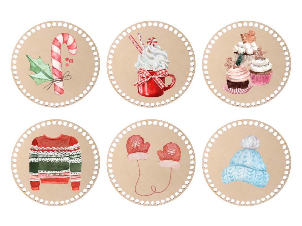 Kolekcija od 6 okruglih izrezaka od brezove šperploče s božićnim motivom prikladna je za izradu elegantnih podmetača i košara koje će uljepšati vaš interijer.