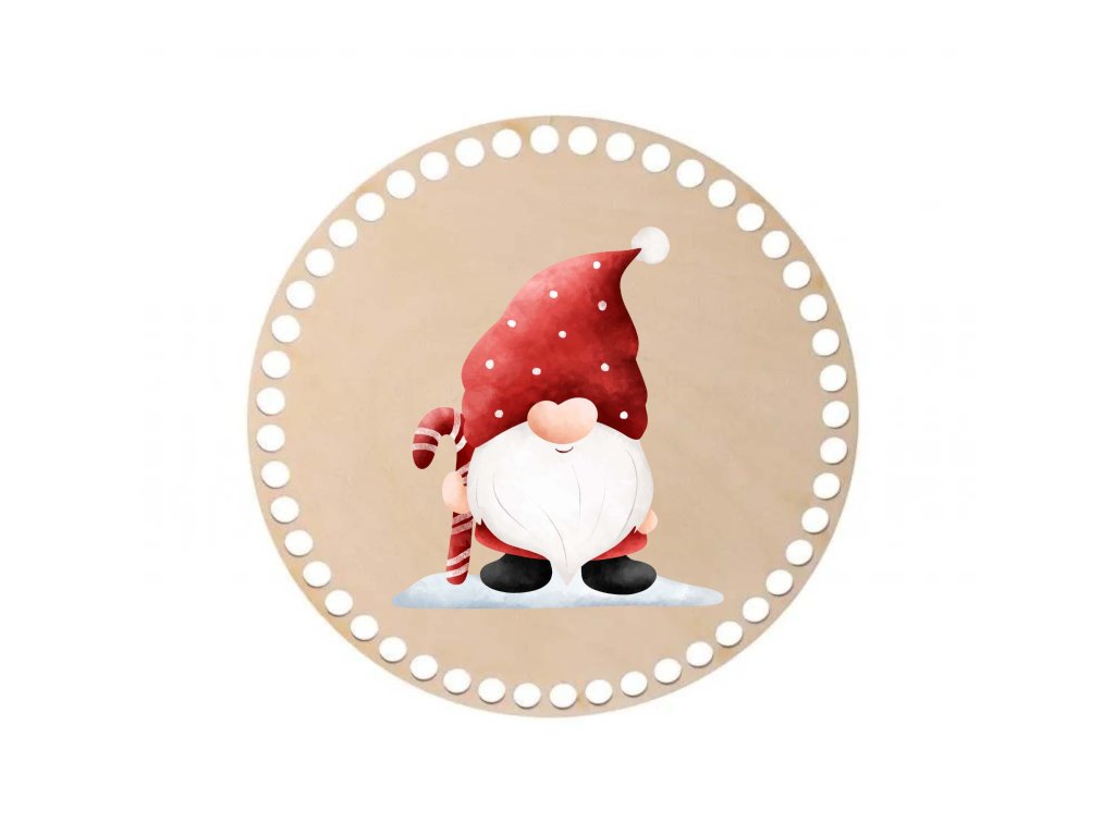 Okrugli drveni poklopac za košaru sa simpatičnim božićnim vilenjakom izrađujemo od brezove šperploče debljine 3 mm. Pogodan je za izradu heklanih košara i organizatora. Nudimo različite veličine.