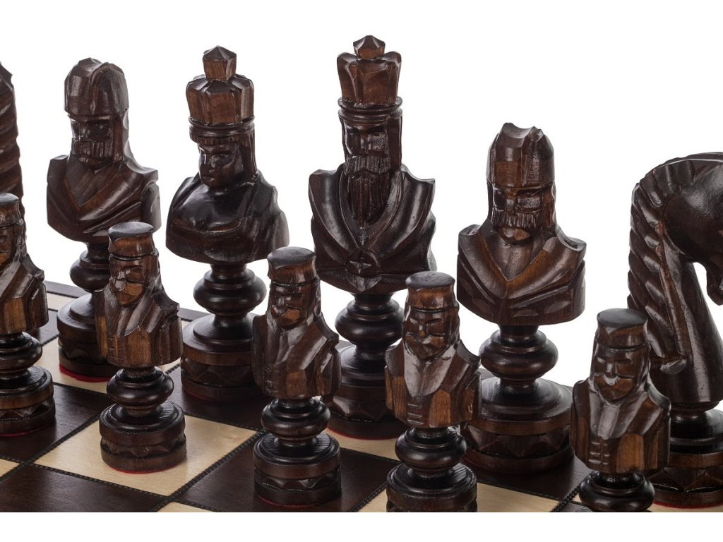 Detaljan drveni šah s velikim prostorom za igru od 82 x 82 cm. Zbog činjenice da su figurice izrezbarene ručno, svaki je komad original. Figura kralja je visoka 22 cm.