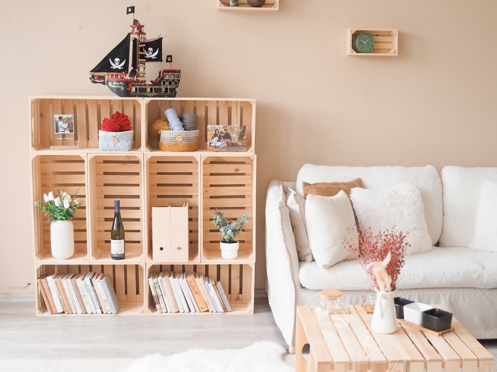 Svjež i prirodan, ovo je namještaj izrađen od drvenih sanduka. Stjenka od drvenih kutija je dimenzija 120x120x24 cm.