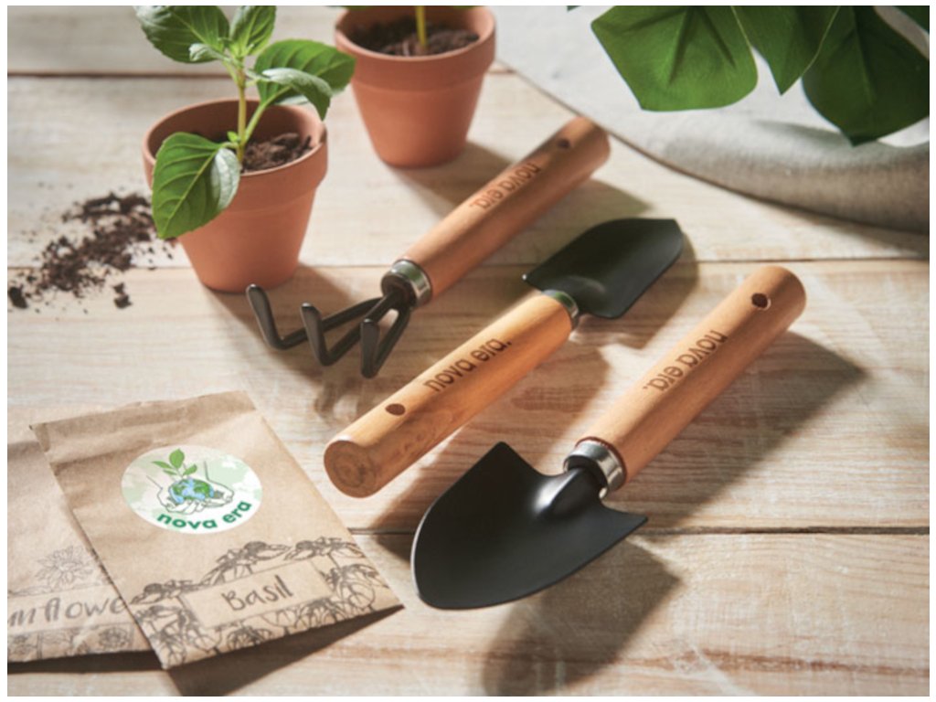 Set uključuje dvije lopate i male grablje za pripremu površine tla.