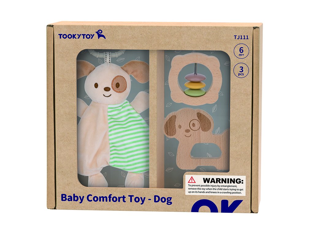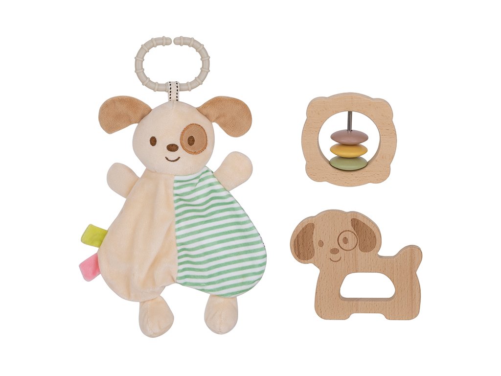 Set uključuje mekanog tekstilnog psa, drvenu zvečku sa šarenim prstenovima i igračku u obliku psa. Pojedinačni proizvodi dizajnirani su tako da dobro pristaju u male dječje ruke, razvijaju finu motoriku i pružaju djeci osjećaj ugode, na primjer kada im izlaze prvi zubići.
