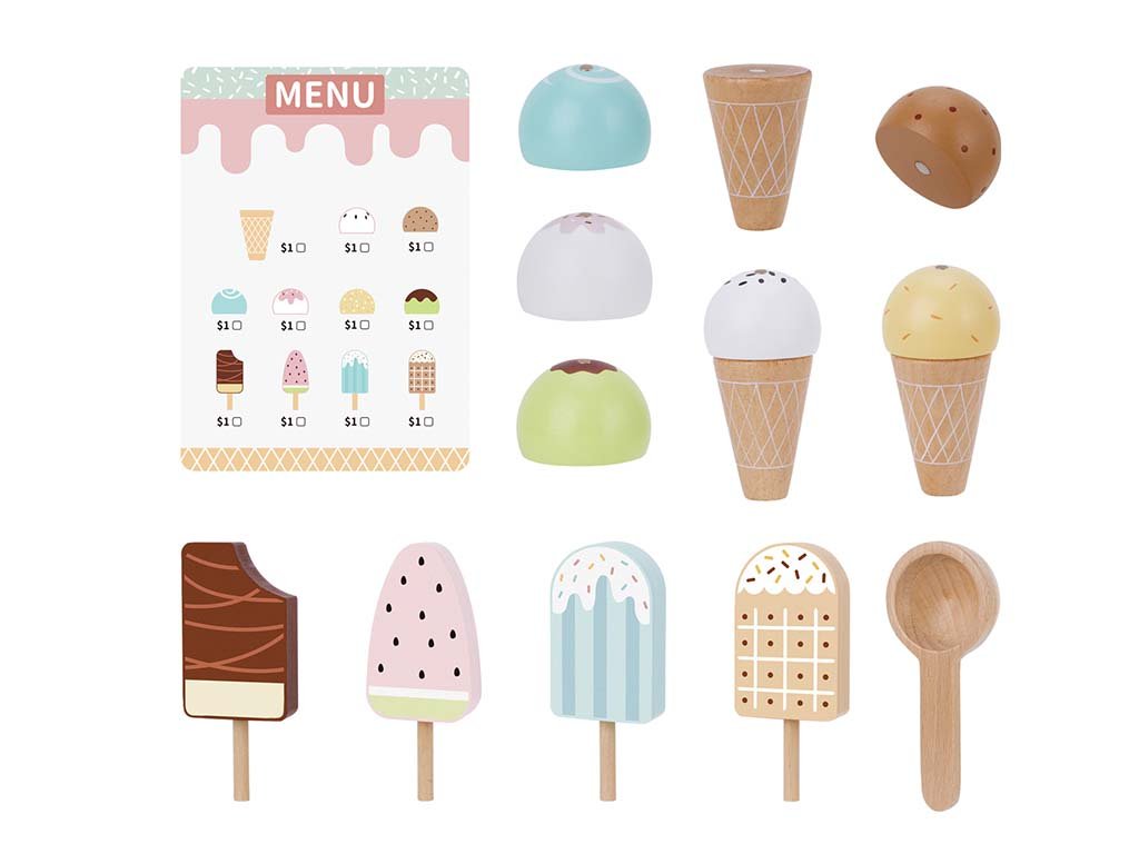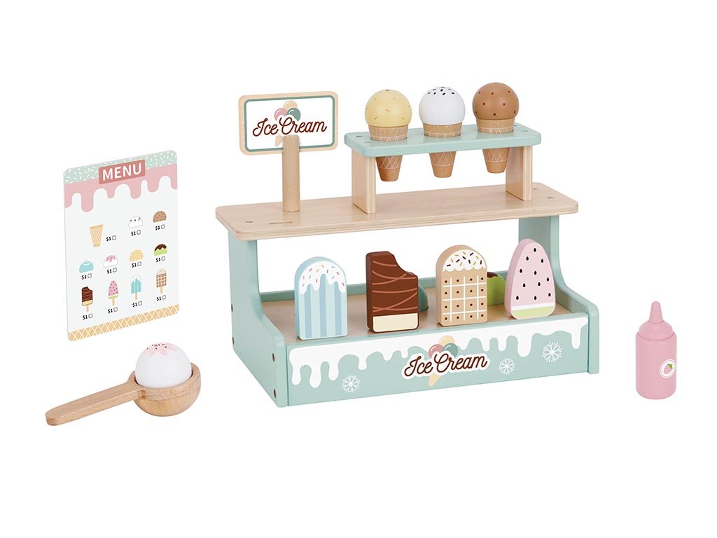 Dječji stalak za sladoled s priborom pomaže djeci da poboljšaju komunikacijske i društvene vještine. Realističan izgled i funkcije podržavaju dječju kreativnost, maštu i samostalnost. Pomoću drvene žlice djeca grabe kuglicu sladoleda i, zahvaljujući jakom magnetu, postavljaju je točno na kornet.