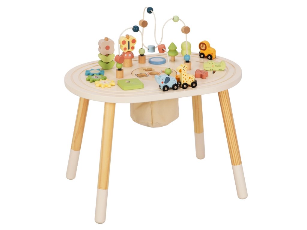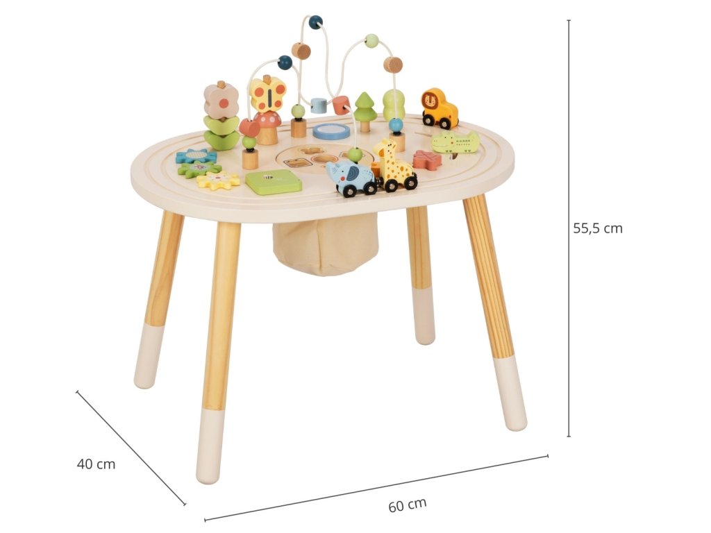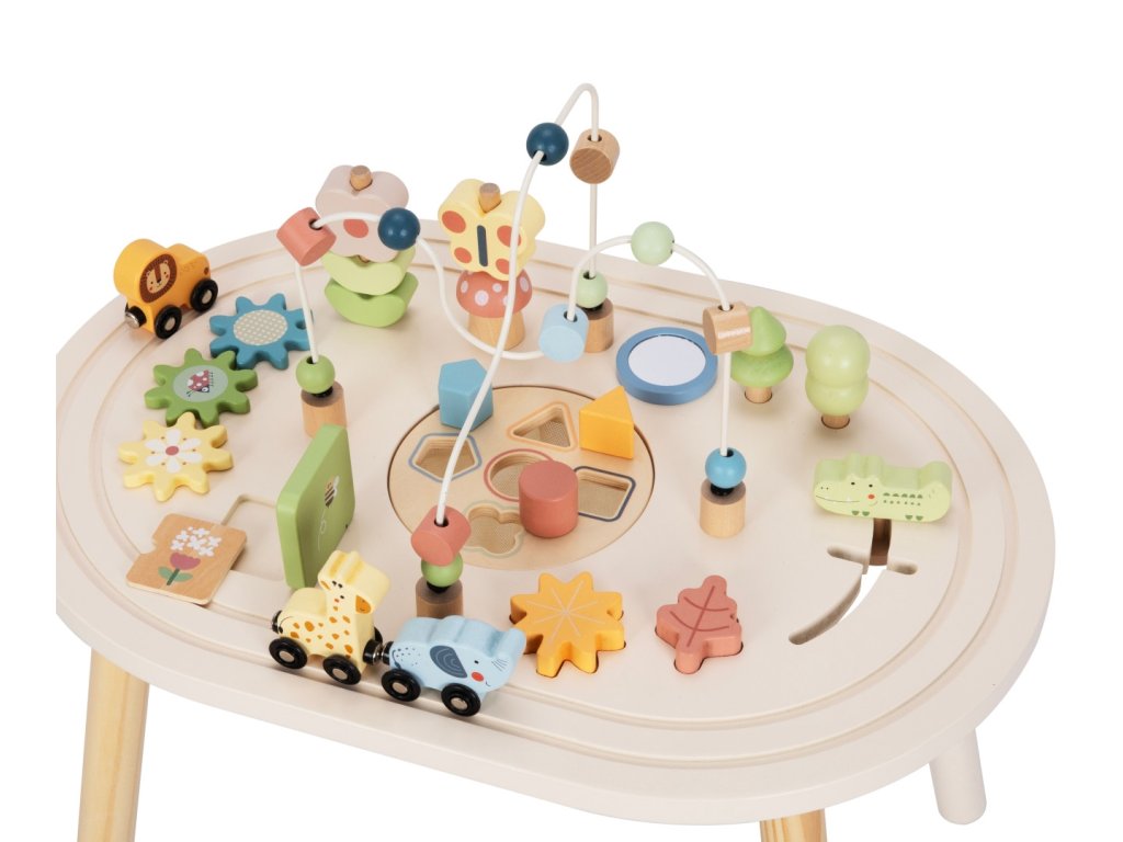 Stol je opremljen raznim aktivnostima koje razvijaju finu motoriku, koordinaciju ruku i očiju te logičko razmišljanje. Djeca mogu pomicati, rotirati, slagati i istraživati pojedinačne elemente te učiti principe uzroka i posljedice na razigran način. Svaki dio stola nudi drugačiju vrstu zabave, tako da djeci neće lako dosaditi.