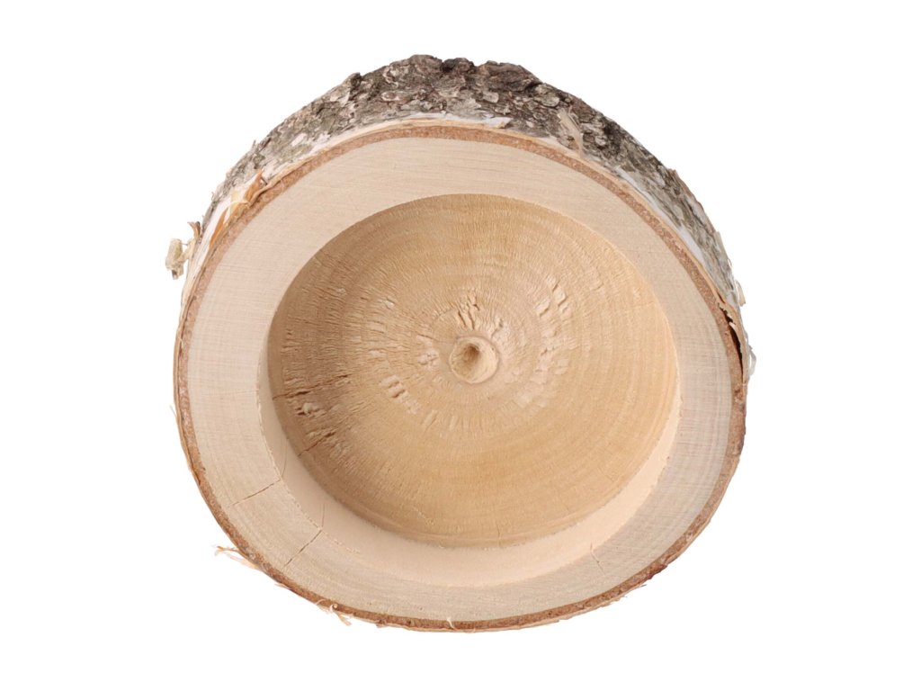 Svijećnjak je izrađen od prirodnog drva breze s korom i svaki komad je original koji može varirati u konačnom izgledu i veličini. Promjer svijećnjaka varira između 10 - 13 cm.