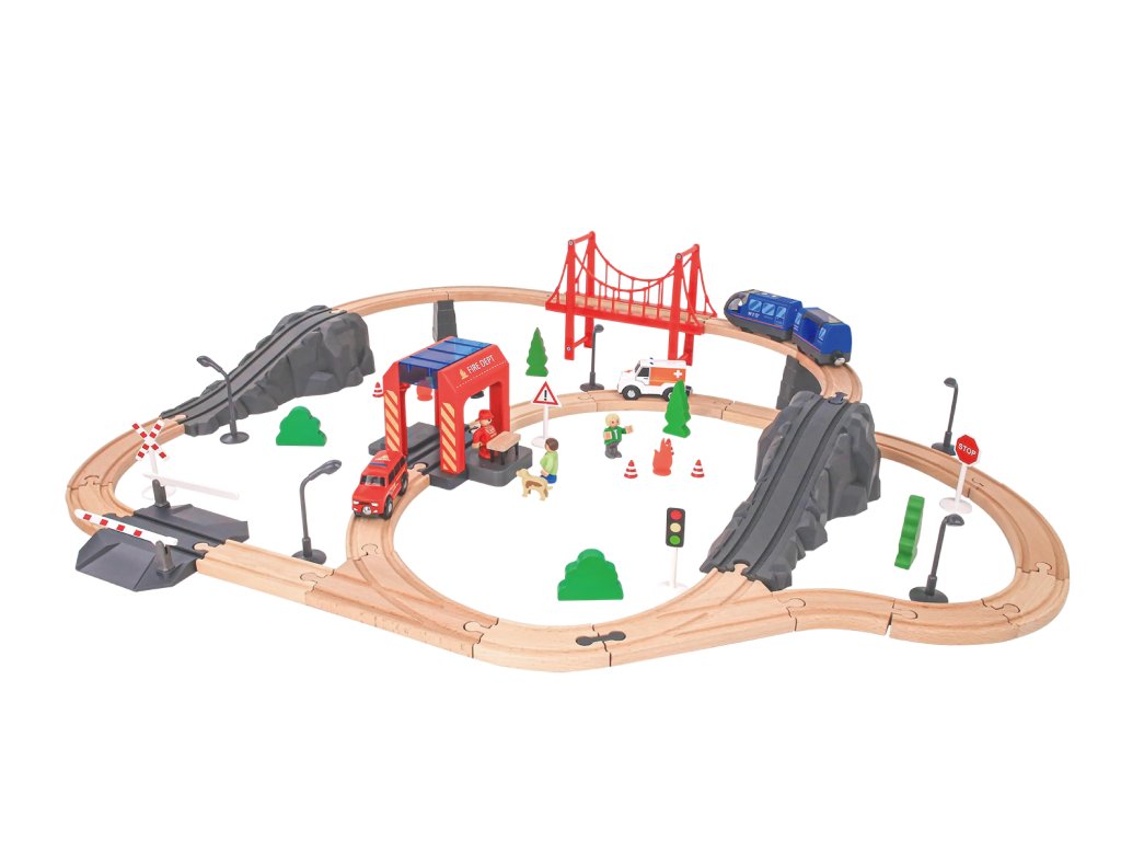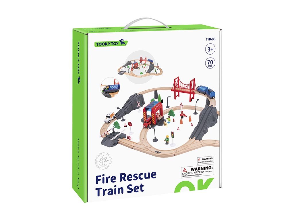 Drveni set vlaka sadrži 70 dijelova koji, kada se sastave, stvaraju jedinstvenu avanturu. Set uključuje vatrogasno vozilo, kola hitne pomoći, figuru vatrogasca, prometne znakove, željeznička svjetla, drveće, grmlje i mnoge druge dodatke. Zahvaljujući njima, djeca mogu stvarati vlastite priče i scenarije spašavanja koji potiču njihovu maštu i kreativnost.