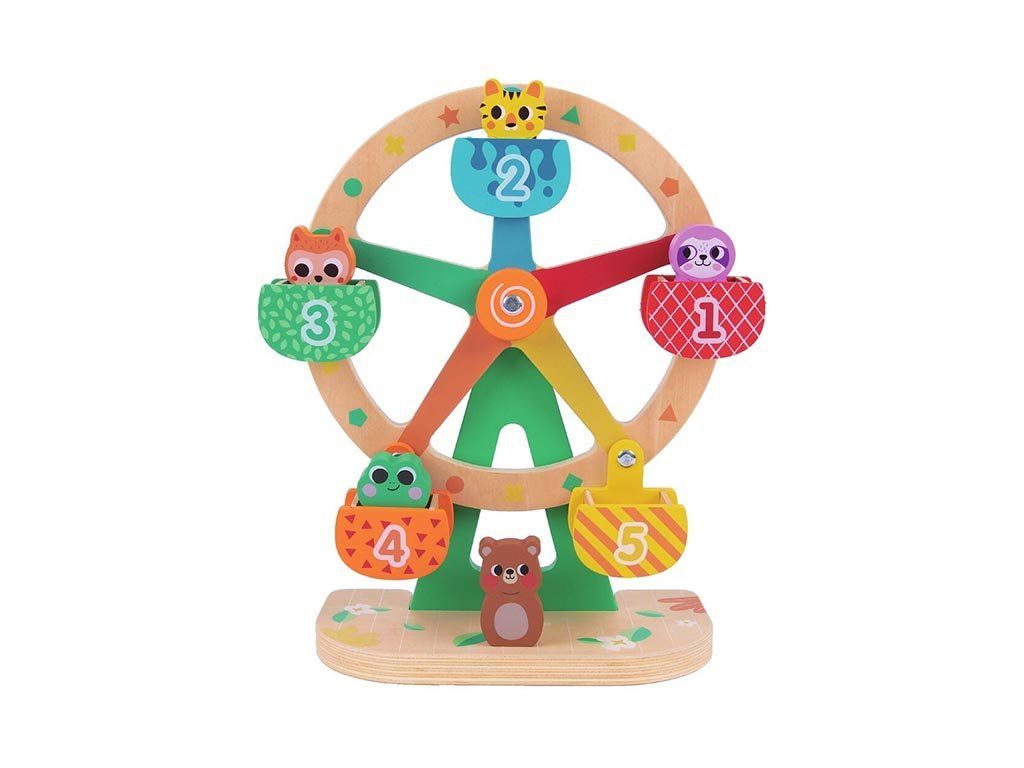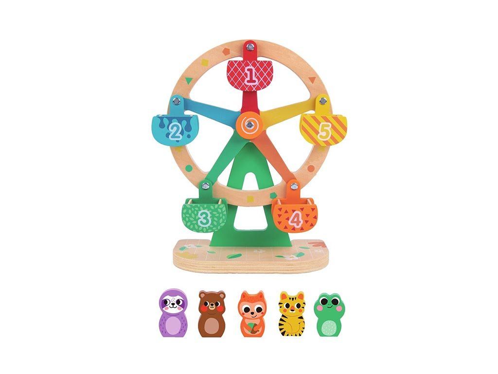 Svaka kabina ima drugačiji broj i boju, tako da djeca mogu vježbati boje, brojeve i finu motoriku dok se igraju. Vrtuljak također uključuje slatke figure životinja - ljenjivca, plišanog medvjedića, vjevericu, tigra i žabu - koje se mogu ukloniti i ponovno umetnuti u kabine.