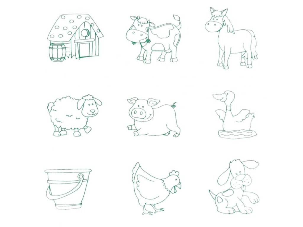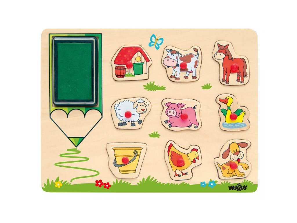 Kombinacija markica i slagalica. Na dnu svake životinje nalazi se gumeni pečat za koji ćete pronaći jastučić u boji izravno na površini ovog proizvoda. Djeca mogu bojati otisnute životinje i od njih napraviti cijele slikovne kompozicije.
