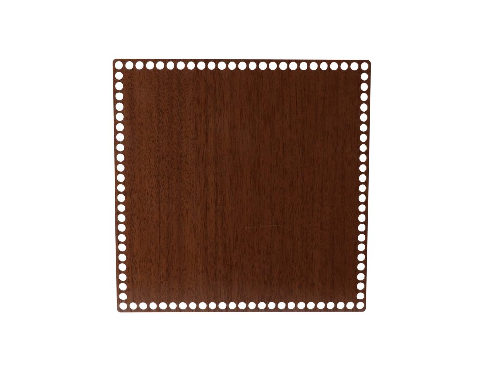 U ponudi imamo četvrtastu podlogu za košaru s tamnim dekorom oraha, debljine 3 mm, s rupama promjera 9 mm, u više veličina . Pogodan je za izradu heklanih košara od konca i niti.